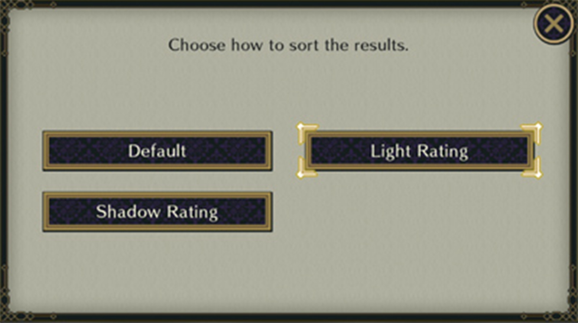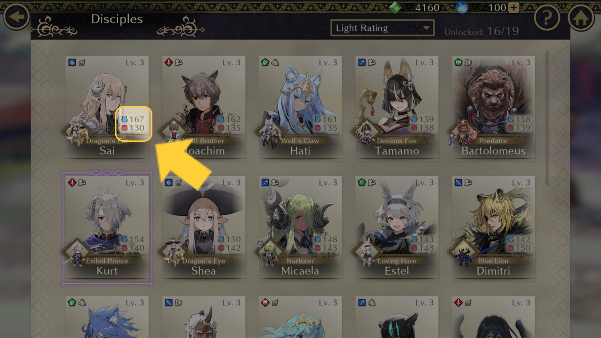 Light Rating and Shadow Rating sorts disciples by the highest rating of the selected side. The disciple's icon will also display their current rating.