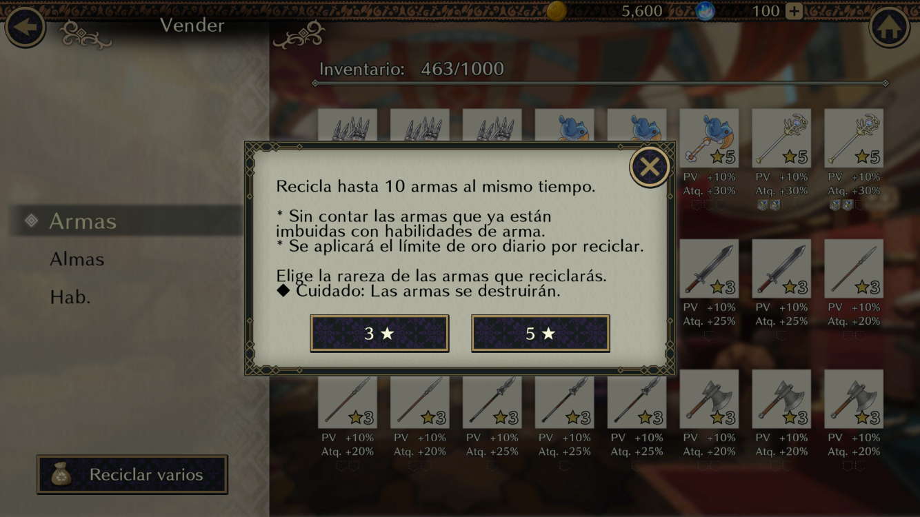 Cuando uses "Reciclar varios", podrás seleccionar armas desde 3 ★ hasta 5 ★.