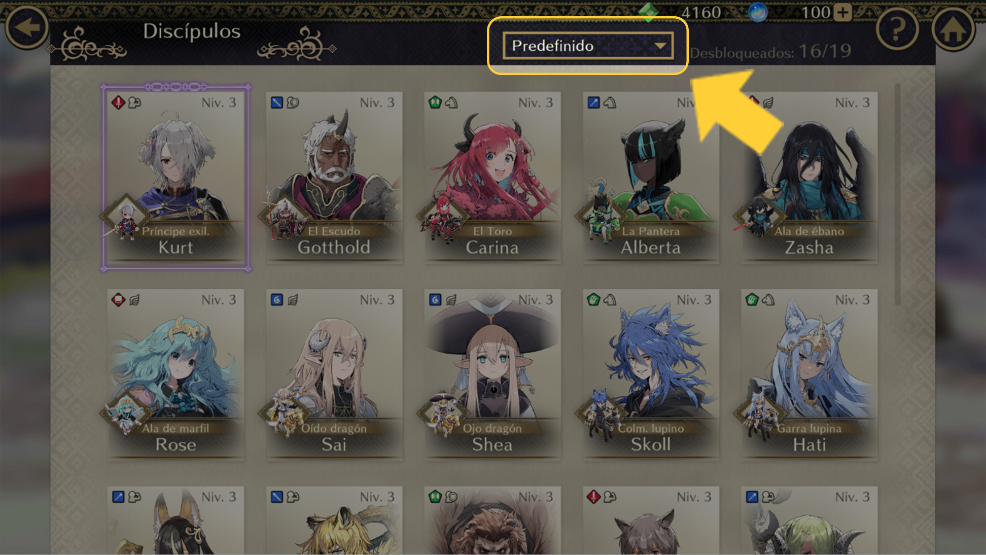・Aparecerá un icono de subida de nivel en la esquina superior derecha del nivel del discípulo en la pantalla de inicio. Solo podrás ver este icono cuando dispongas de todos los materiales necesarios para subir de nivel a dicho discípulo.