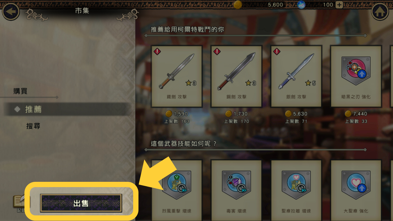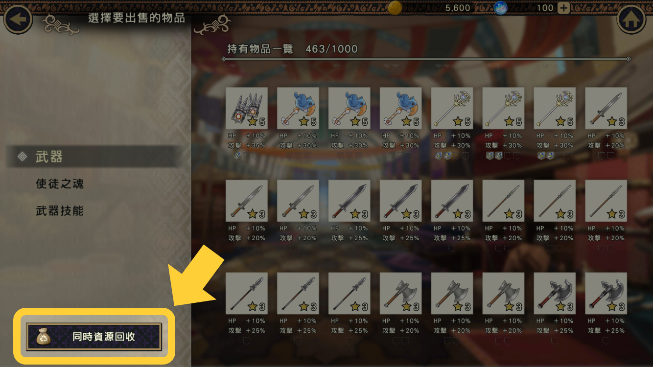 3. 「選擇要出售的物品」>「武器」>選擇「同時資源回收」