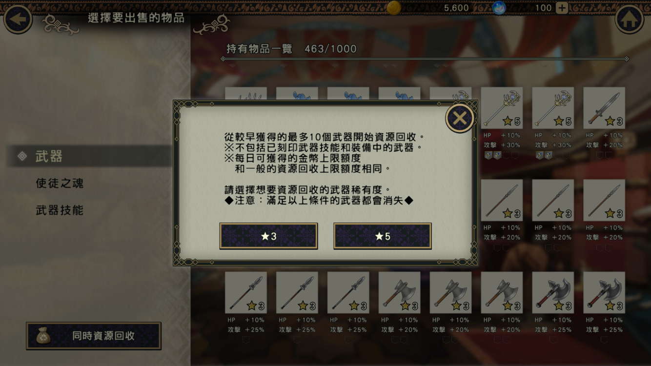 4. 可從彈出式視窗內的「★3」或「★5」中任意選擇稀有度來進行回收